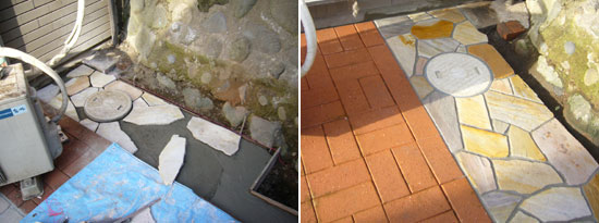素焼き風の輸入レンガと、砂岩の石貼りの組合せで、洋風のテラスを作っていきます。 門へのアプローチ部分は、ジェラストーンを貼っていきます。